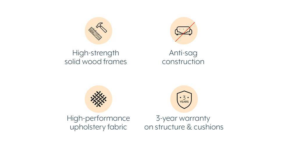 This sofa’s frame is made from seasoned solid wood with plywood boxing that undergoes a 3-step treatment for protection against borers and is kiln-dried for moisture control.